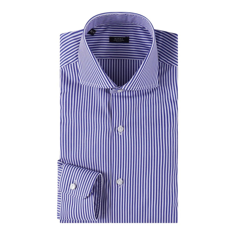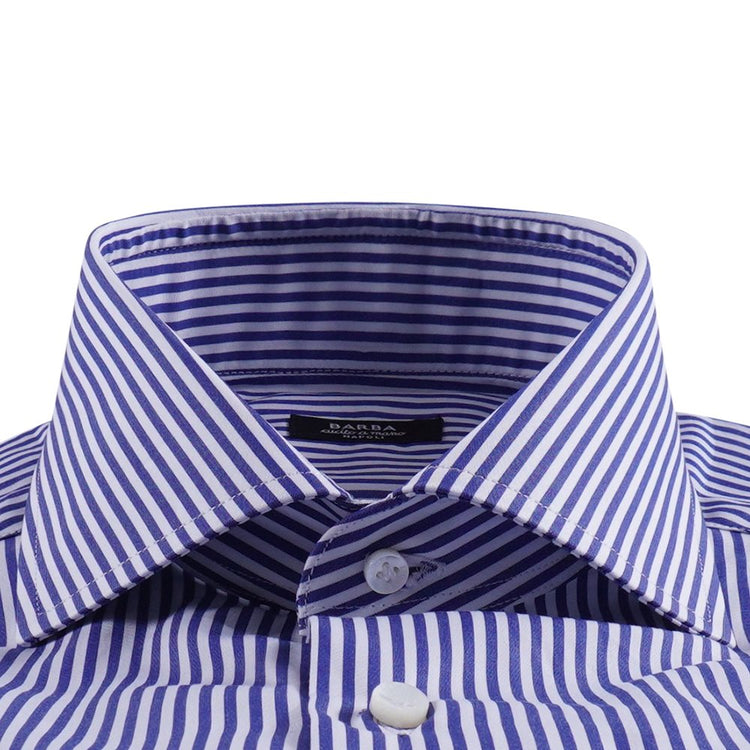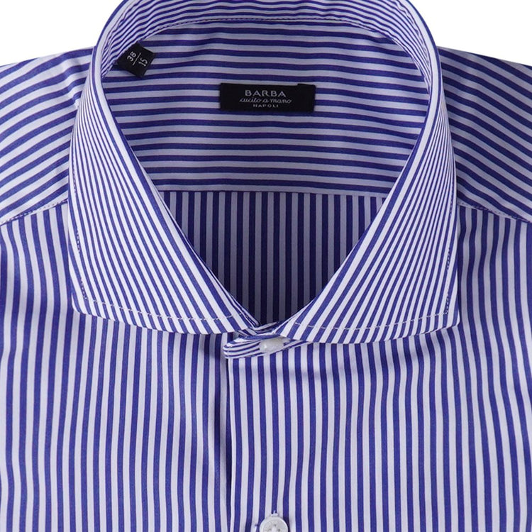 Dit overhemd in wit en blauw gestreept katoen heeft een klassieke kraag en de knoopsluiting aan de voorkant zorgen voor een nette afwerking, terwijl de lange mouwen met manchetten een strakke look bieden. Met de hand vervaardigd in Italië met oog voor detail, voorzien van gerimpeld achterpand, ronde manchetten en knopen van parelmoer. Materiaal: 100% Katoen