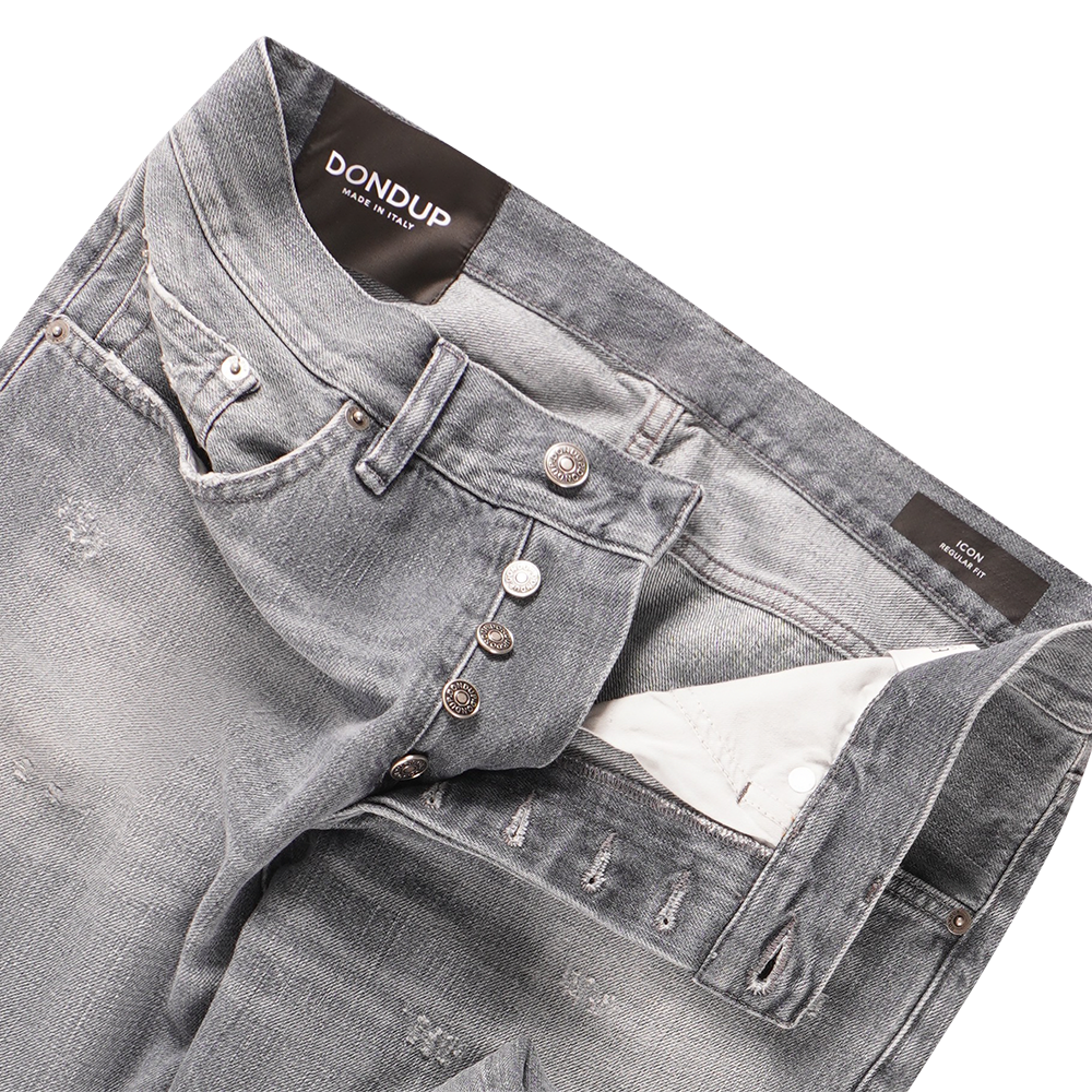De Dondup jeans in grijze kleur is gemaakt van hoogwaardig katoen met stretch, wat zorgt voor extra comfort en bewegingsvrijheid. Met een regular fit biedt deze jeans een tijdloze en relaxte pasvorm. Dankzij de destroyed look maakt het de jeans sportief.