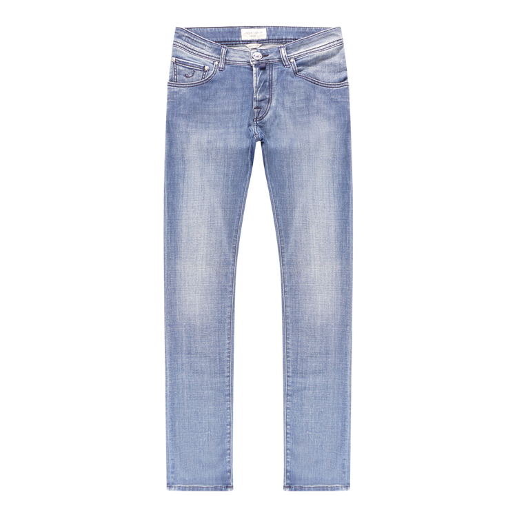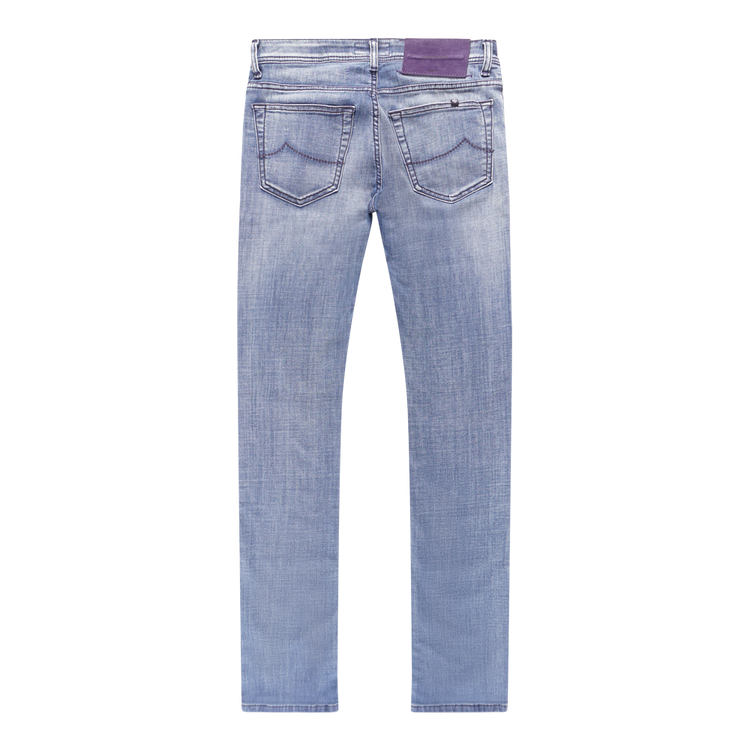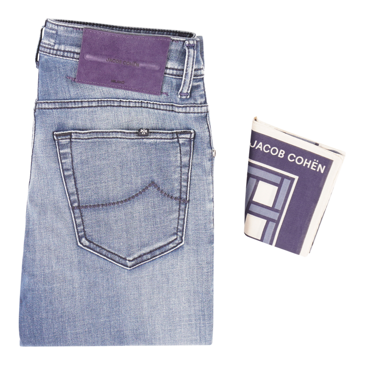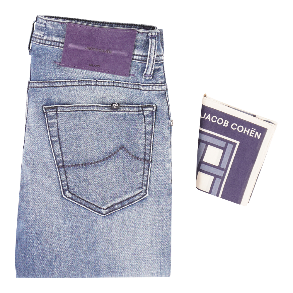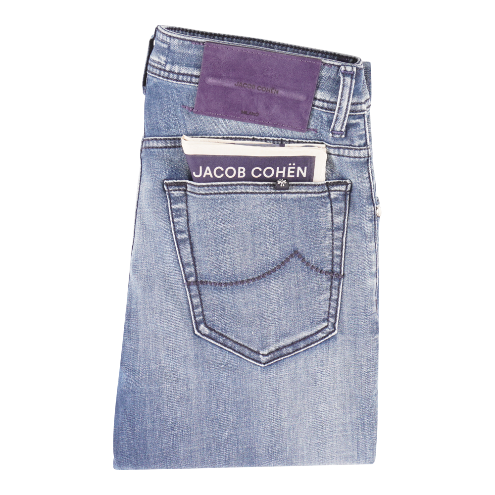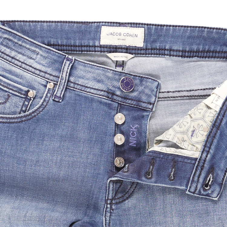 Deze stijlvolle jeans van Jacob Cohën heeft een diepe blauwe kleur. Op de achterzijde vind je een merkpatch en de knoop aan de voorzijde hebben evenals dezelfde diepe blauwe kleur. De jeans komt in een medium blauwe wassing met donker blauwe stiksels en een paars blauwe suede patch. Materiaal: 98% katoen, 2% elastan
