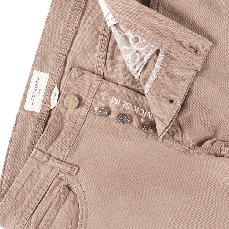 Ervaar de verfijnde stijl van de Jacob Cohën Nick Slim jeans. Deze Taupe denim met slim-fit pasvorm biedt ultiem comfort door de zachte stretchstof. Het 5-pocket design is afgewerkt met een knoopgulp en een logopatch op de achterkant. Een must-have voor wie op zoek is naar tijdloze en elegante jeans. Material: 98% katoen, 2% elastaan