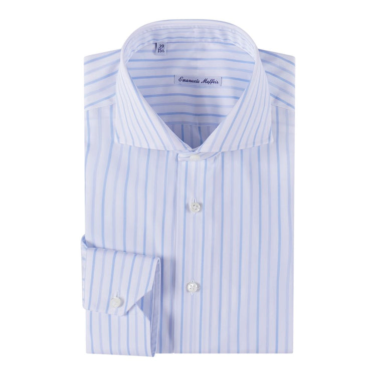 Dit overhemd van Emanuele Maffeis is uitgevoerd in een verfijnd blauw streepdesign dat zorgt voor een elegante en tijdloze uitstraling. De zachte katoenen stof voelt comfortabel aan en draagt de hele dag aangenaam, terwijl de klassieke kraag en cleane belijning het shirt een formeel maar veelzijdig karakter geven. Dankzij de ademende kwaliteit is dit overhemd geschikt voor zowel zakelijke als casual gelegenheden. Materiaal: 100% katoen.