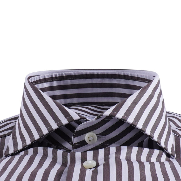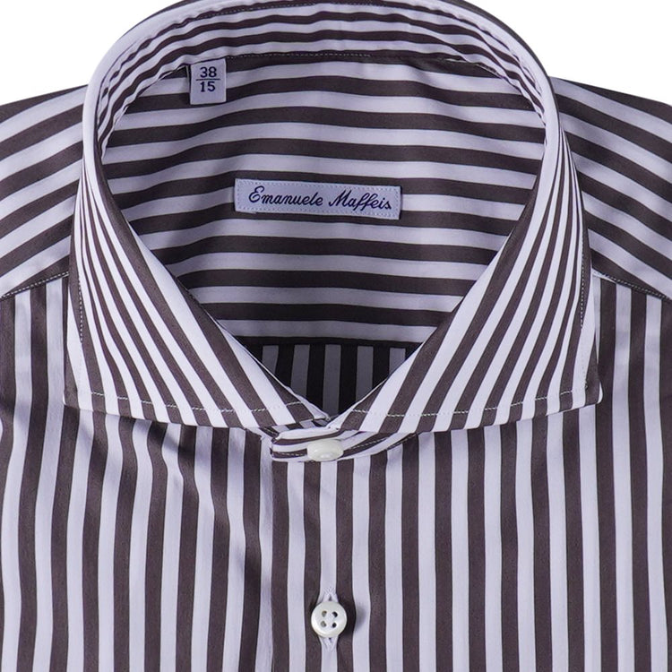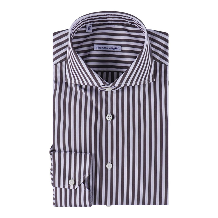 Dit overhemd van Emanuele Maffeis is uitgevoerd in een verfijnd bruinwit streepdesign dat zorgt voor een elegante en tijdloze uitstraling. De zachte katoenen stof voelt comfortabel aan en draagt de hele dag aangenaam, terwijl de klassieke kraag en cleane belijning het shirt een formeel maar veelzijdig karakter geven. Dankzij de ademende kwaliteit is dit overhemd geschikt voor zowel zakelijke als casual gelegenheden. Materiaal: 100% katoen.