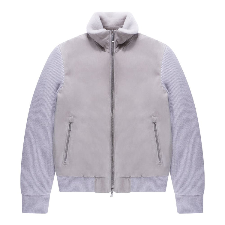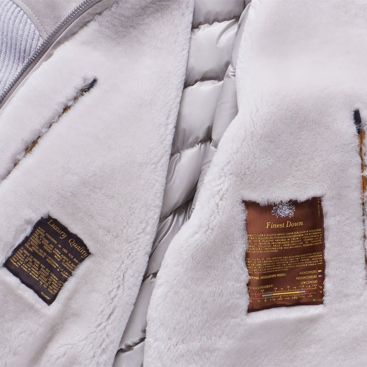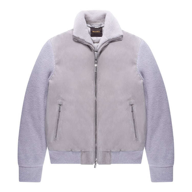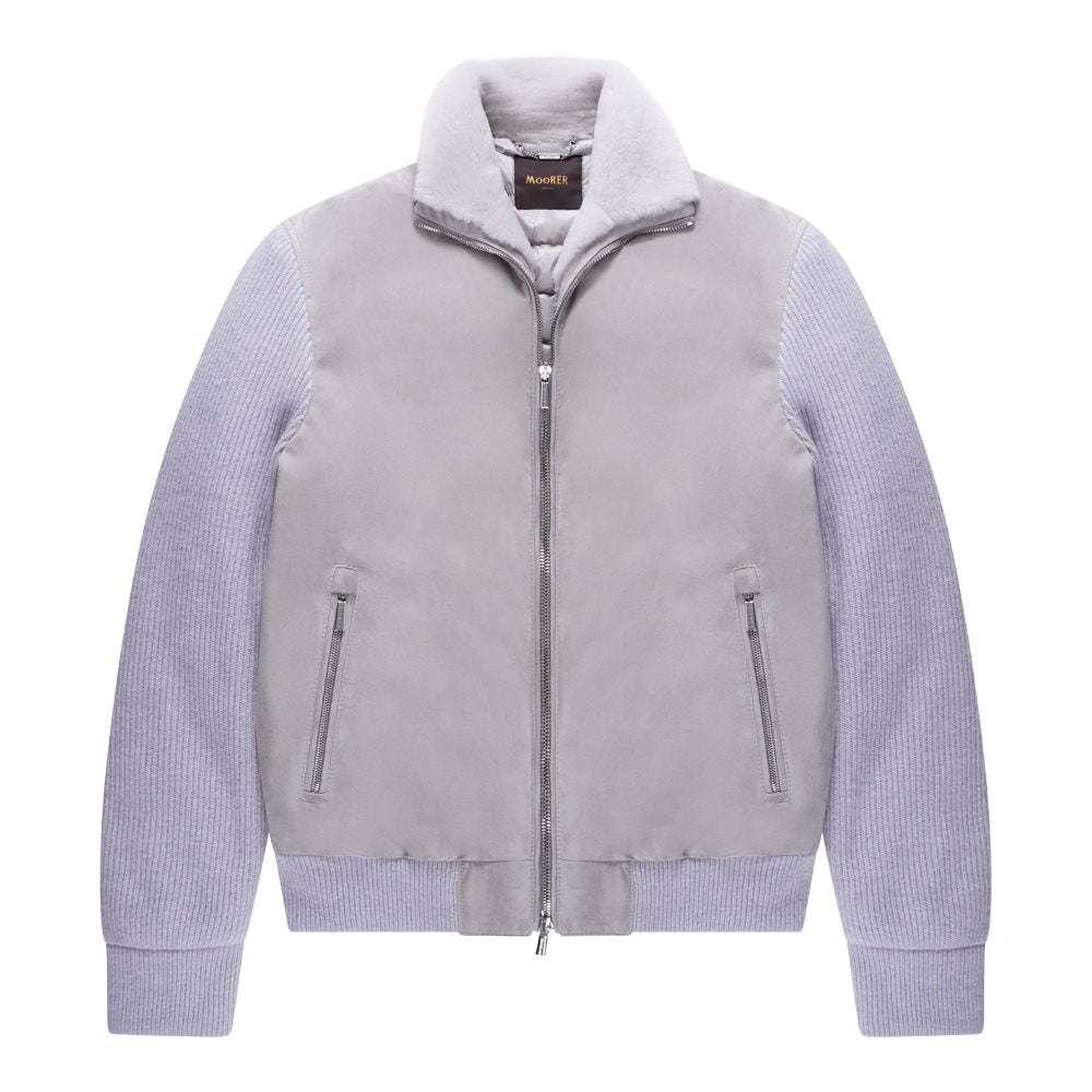 Onweerstaanbaar luxueus: de blouson 'Campiglio' van MOORER combineert een zachte brei van wol en kasjmier met soepel suède en schapenvacht voor een statement in de winter. De lichte donsvoering is comfortabel warm en de kenmerkende, gedetailleerde afwerking perfectioneert het ontwerp stijlvol voor een look die comfort en luxe moeiteloos combineert. Materiaal: 70% Schurwolle /30%Cashmere.
