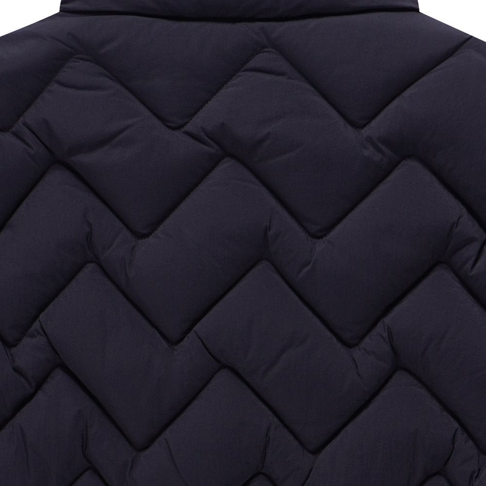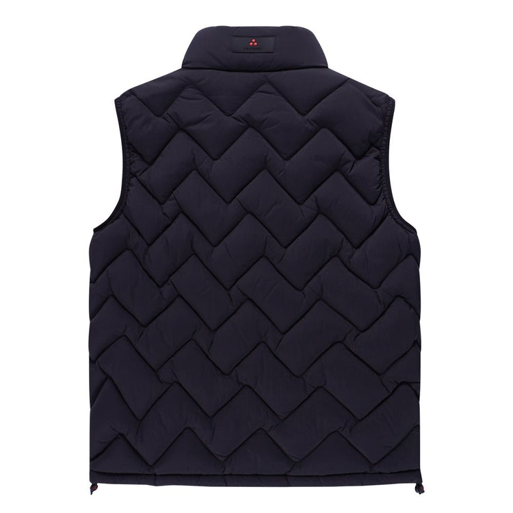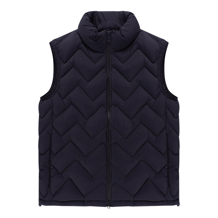 Een ultralichtgewicht 20 denier nylon gewatteerd bodywarmer, weegt slechts 50 gram en heeft een semi-matte afwerking. Het gewatteerde patroon met chevrongroeven, de centrale ritssluiting met dubbele schuif in contrasterende kleur en de opstaande kraag geven het kledingstuk een opvallende grafische look en benadrukken het eigentijdse karakter. De gecertificeerde natuurlijke donsvulling zorgt voor warmte en lichtheid, terwijl het ideale comfort behouden blijft, zelfs in laagjes. De stof is waterafstotend en donsdicht, met een PFC-vrije (gefluoreerde verbindingen) waterafstotende behandeling, voor een effectieve en verantwoorde bescherming. Een veelzijdig kledingstuk, ideaal voor dagelijkse laagjes. Materiaal: 100% Polyamide