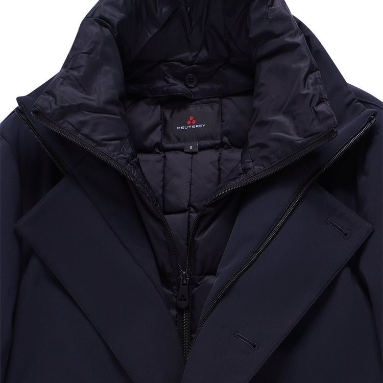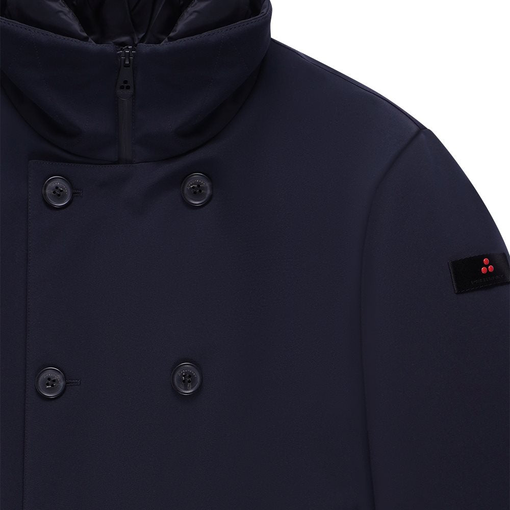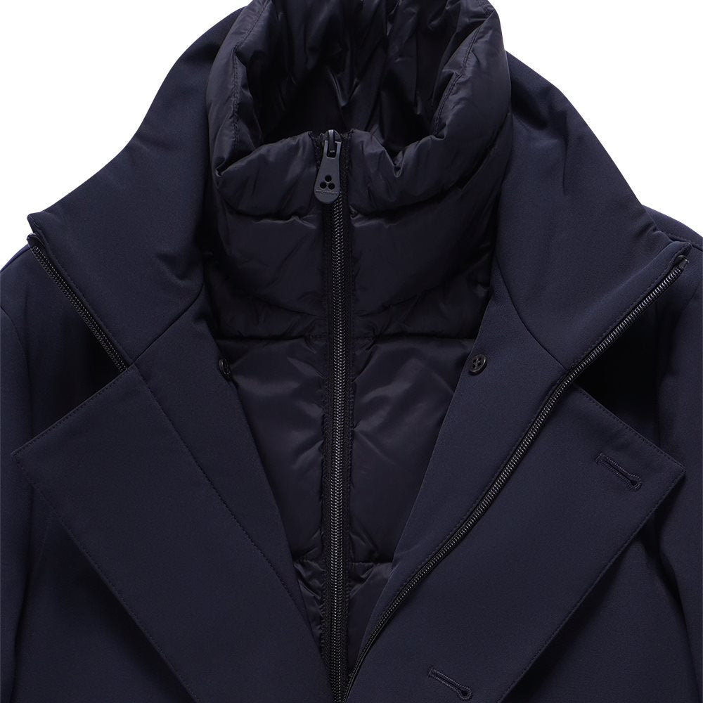 Double-breasted jas van gerecycled stretch polyester met een twillstructuur en een strakke, matte uitstraling. De lichte coating aan de achterkant voegt textuur en zachtheid toe aan de stof, verbetert de verenafdichting en zorgt voor winddichte en waterafstotende eigenschappen. De double-breasted knoopsluiting met een zwarte, verborgen ritssluiting met dubbele schuif is gecombineerd met een opstaande kraag en grote zijzakken, in een urban en eigentijds design. De natuurlijke donsvulling zorgt voor optimaal thermisch comfort in de winter.