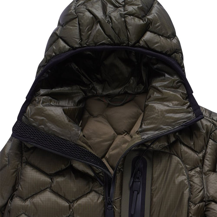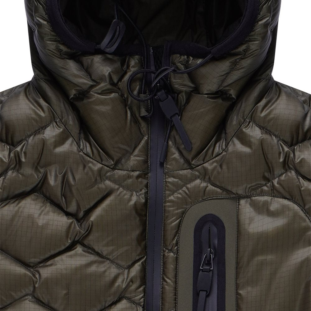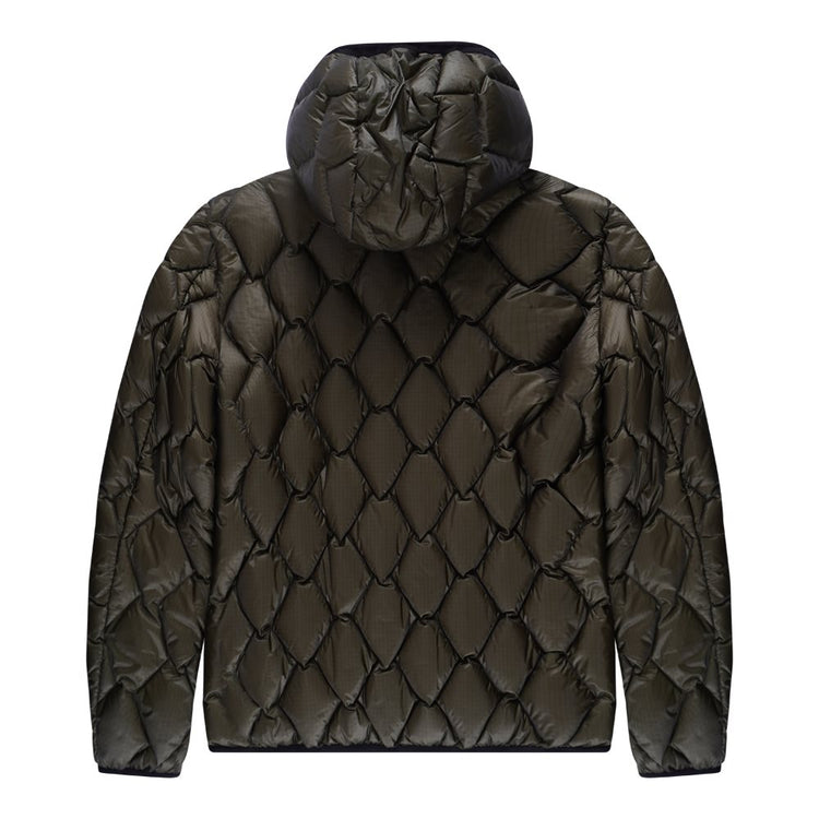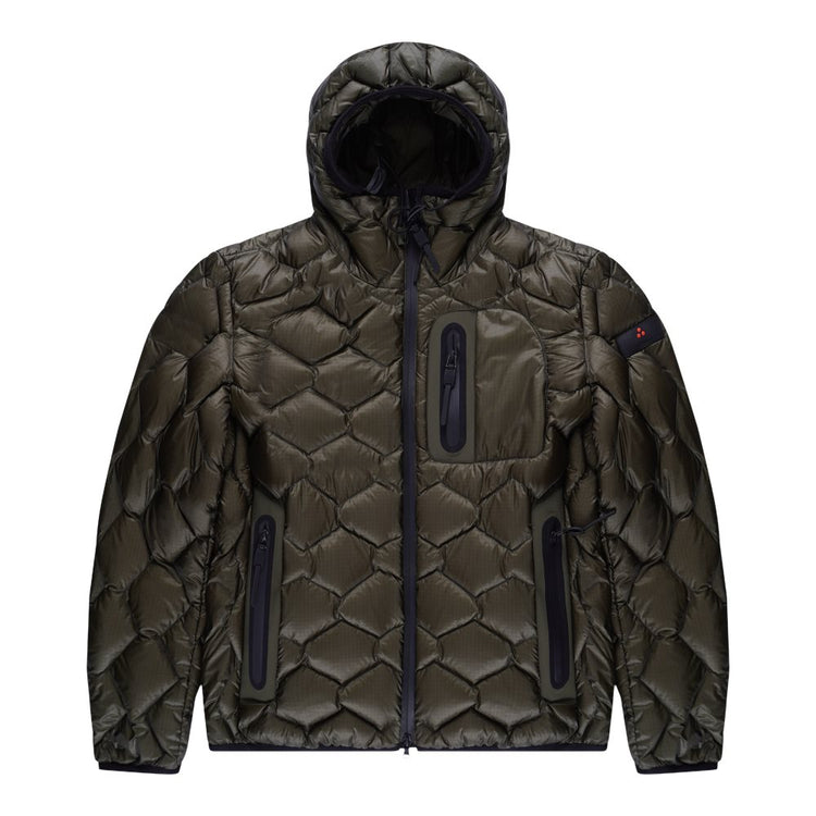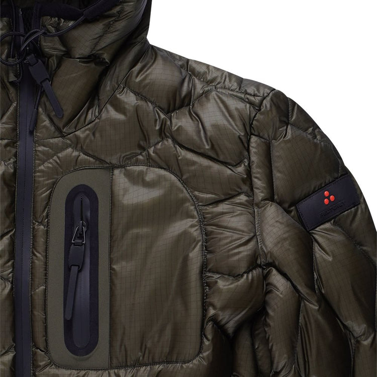 Geometrisch gewatteerd donsjack, gemaakt van 7den ripstop nylon - een ultrafijne en scheurbestendige, glanzende stof - en van stretchnylon gecombineerd met een zachte en warme nylonjersey, verkregen uit fijne garens. Ritszakken aan de zijkanten en een thermisch gesealde borstzak maken dit kledingstuk technischer. De thermisch gesealde ritsen zijn ontworpen om water- en winddicht te zijn, vocht en lucht te weren en te beschermen tegen kou en weer. Zwarte, doorlopende, centrale, spiraalvormige, gecoate omgekeerde rits, ritstrekkers op de zakken en details op de manchetten en capuchon benadrukken het atletische karakter van het kledingstuk. Gecertificeerde natuurlijke donsvulling. Een dynamische en eigentijdse stijl, perfect voor sportliefhebbers en actieve mensen. Materiaal: 100% Polyamide