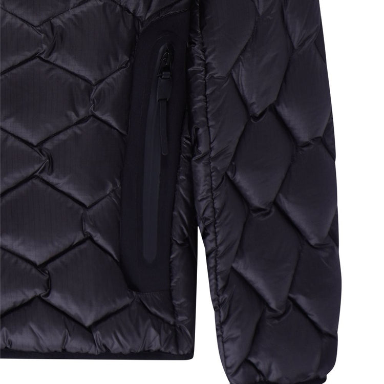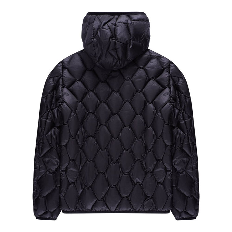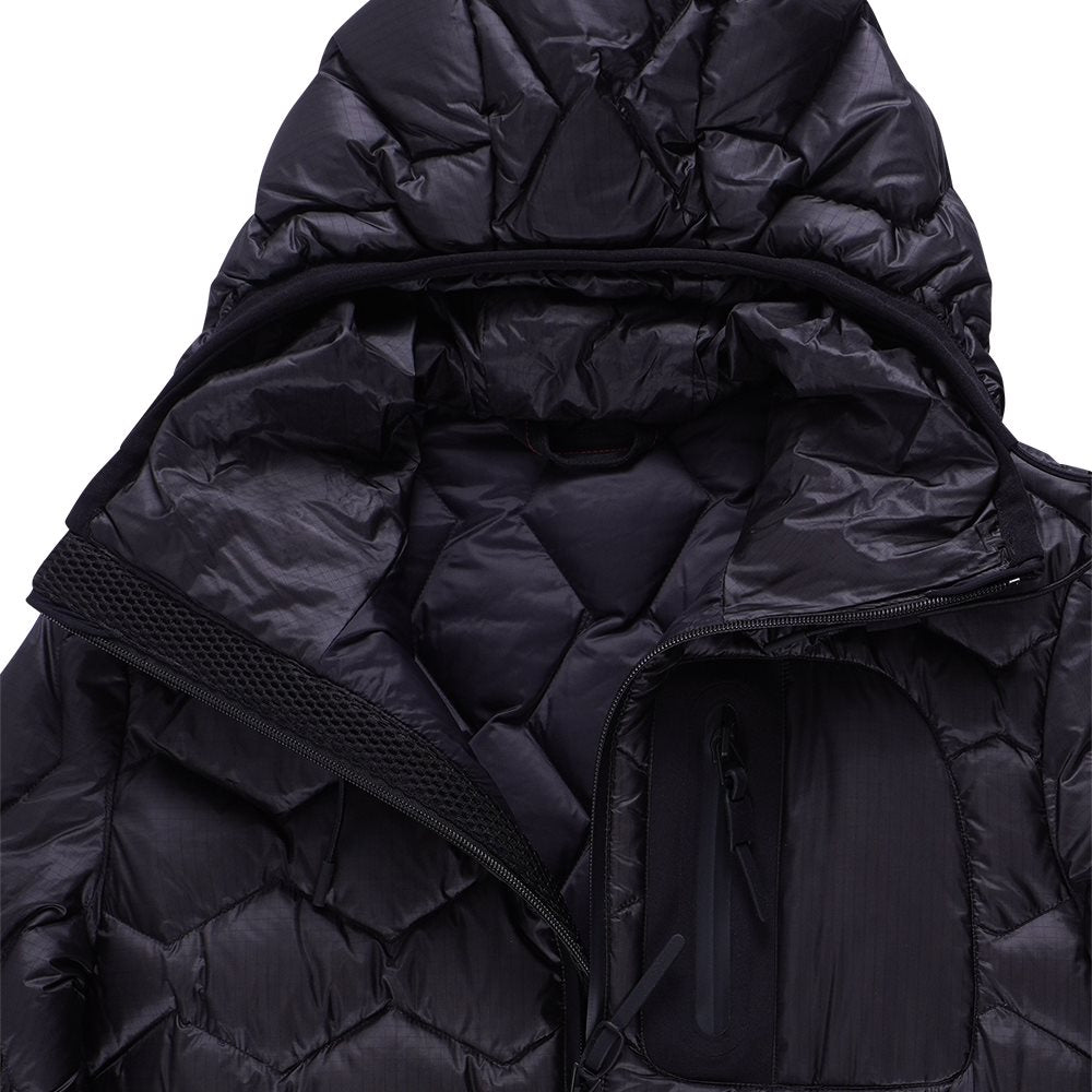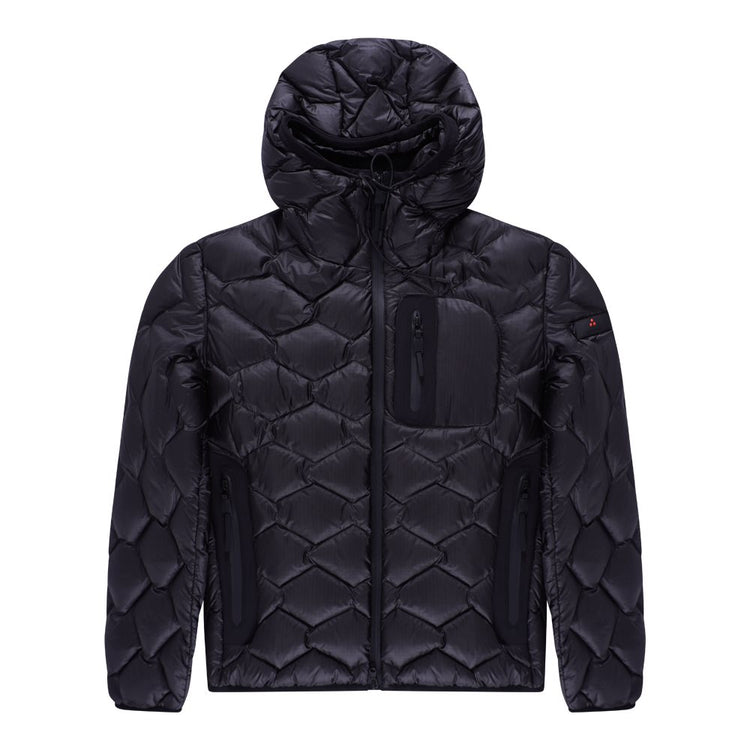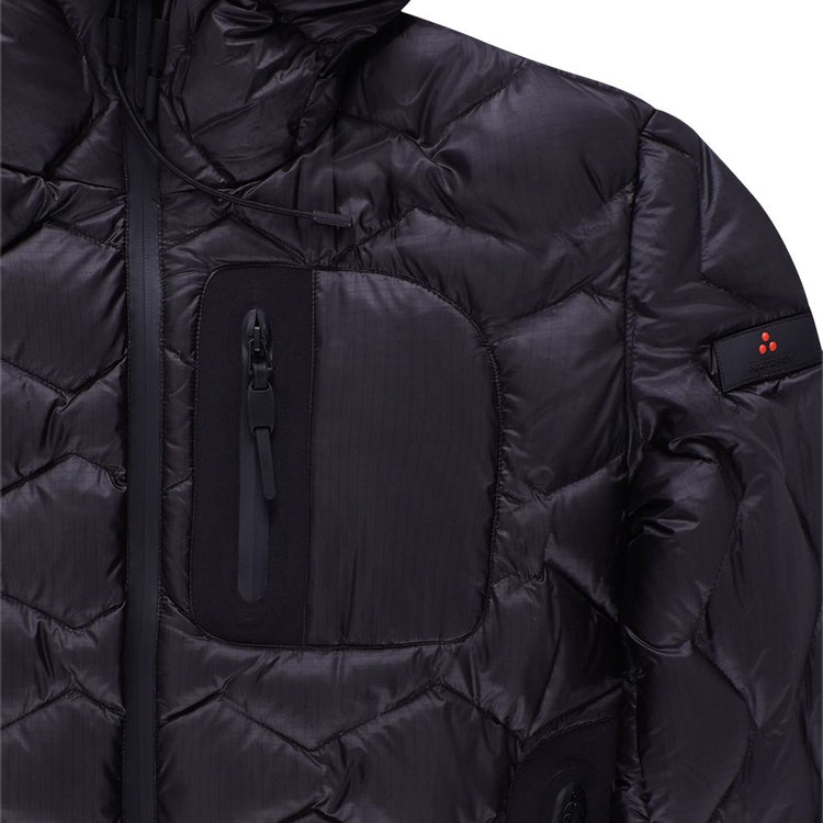 Geometrisch gewatteerd donsjack, gemaakt van 7den ripstop nylon - een ultrafijne en scheurbestendige, glanzende stof - en van stretchnylon gecombineerd met een zachte en warme nylonjersey, verkregen uit fijne garens. Ritszakken aan de zijkanten en een thermisch gesealde borstzak maken dit kledingstuk technischer. De thermisch gesealde ritsen zijn ontworpen om water- en winddicht te zijn, vocht en lucht te weren en te beschermen tegen kou en weer. Zwarte, doorlopende, centrale, spiraalvormige, gecoate omgekeerde rits, ritstrekkers op de zakken en details op de manchetten en capuchon benadrukken het atletische karakter van het kledingstuk. Gecertificeerde natuurlijke donsvulling. Een dynamische en eigentijdse stijl, perfect voor sportliefhebbers en actieve mensen. Materiaal: 100% Polyamide