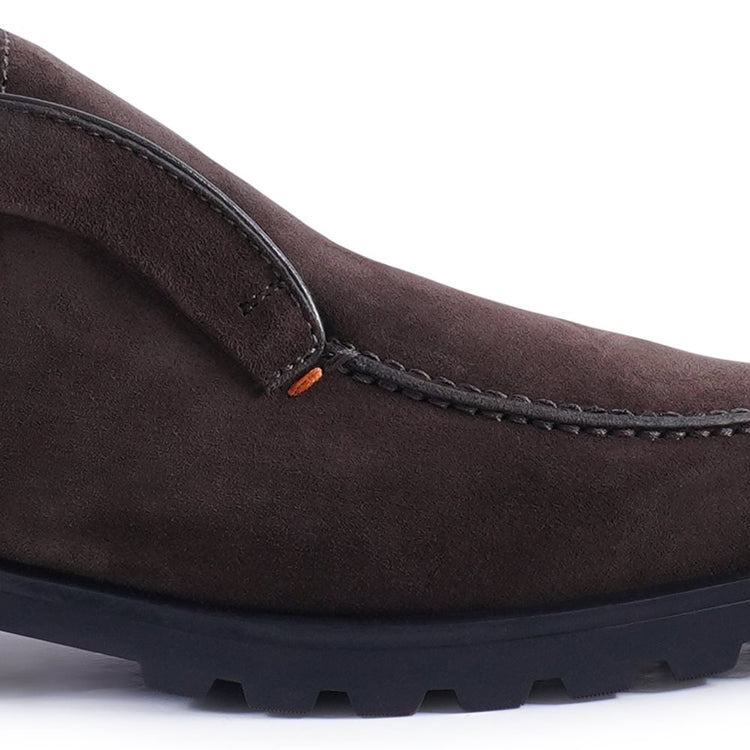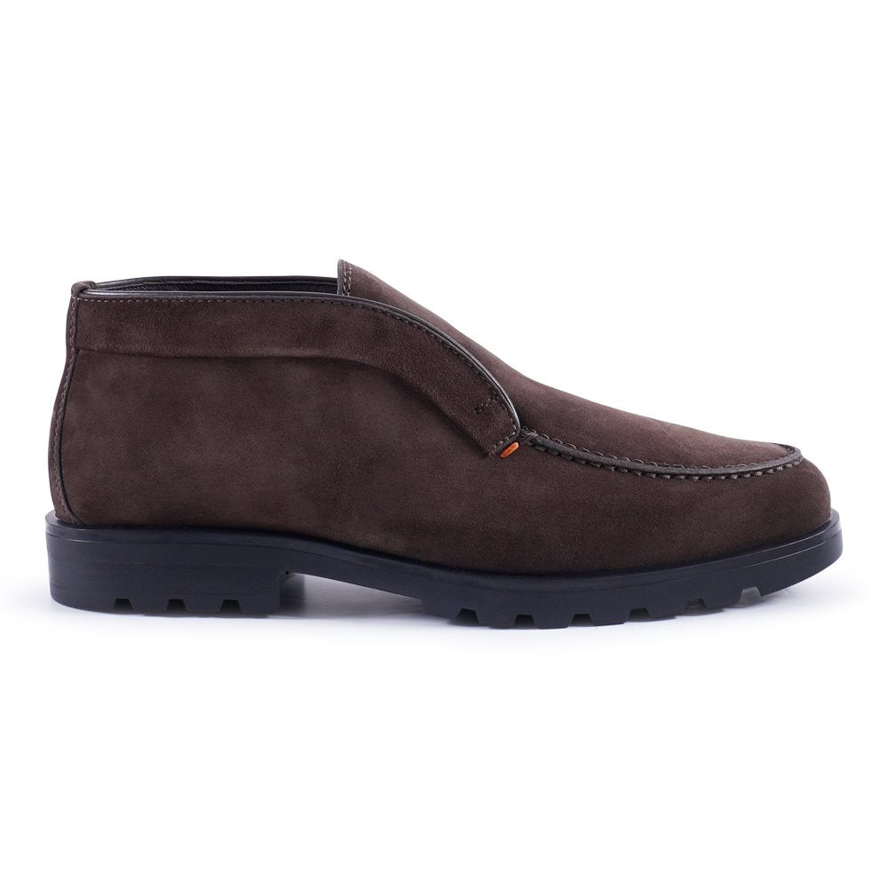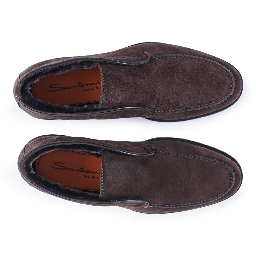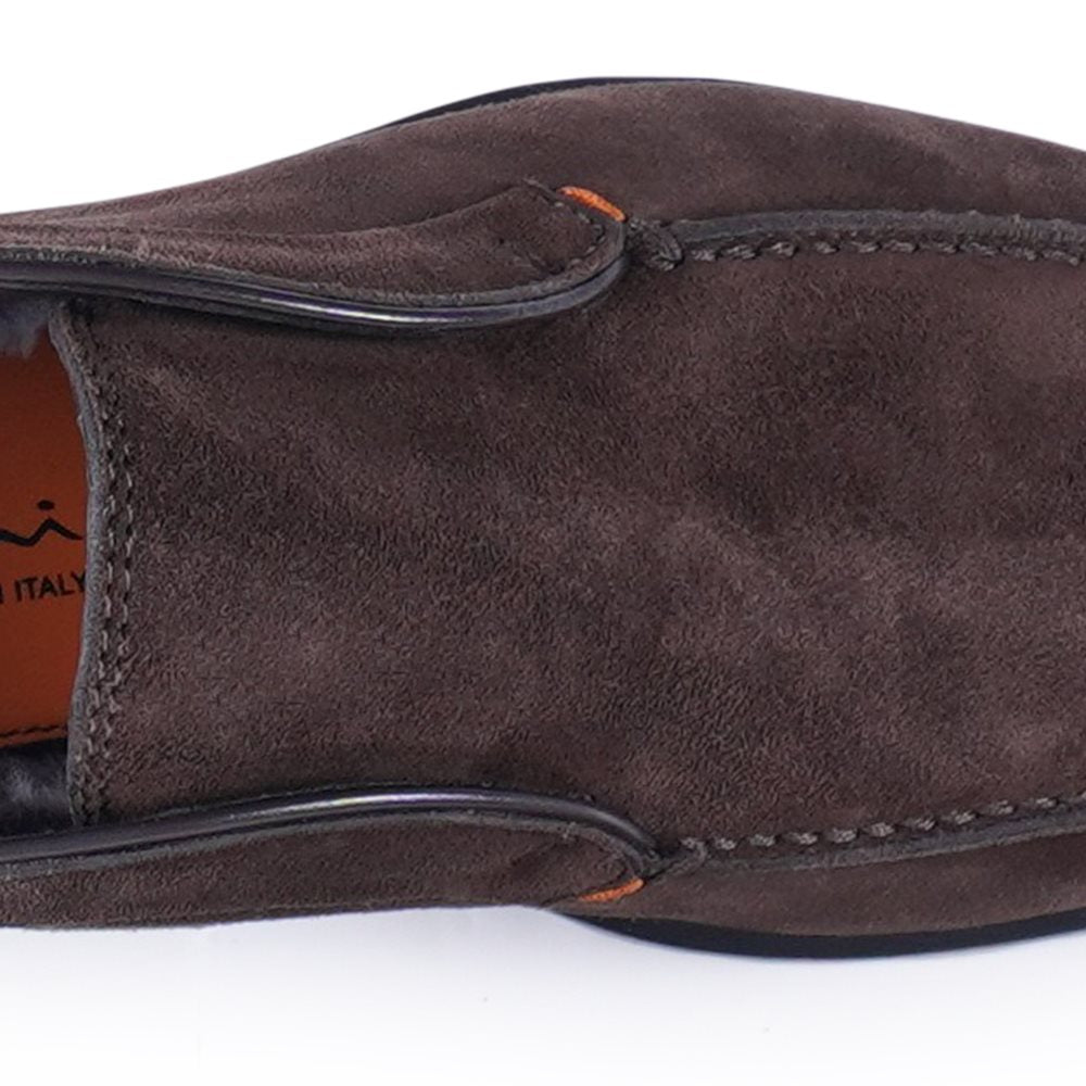 De Detroit instapper van Santoni is uitgevoerd in bruin suède en voorzien van een stevige rubberen profielzool. Dankzij het minimalistische ontwerp zonder veters straalt deze instapper een nonchalante luxe uit.