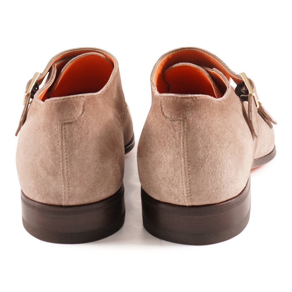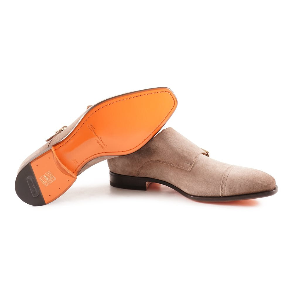 Deze beige instapschoen met gespen voor heren van het merk Santoni. Deze instapschoen met klep molière is uitgevoerd in suède welke is vastgezet met twee zilverkleurige gespen. De binnenzijde is vervaardigd uit leer en een suède contrefort draagt bij aan het loopgemak. De leren zool heeft een glad profiel en de hak meet circa 2 cm.